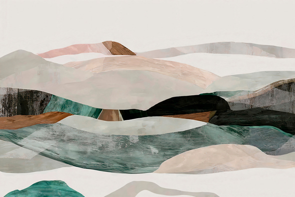 O quadro Horizonte Sereno apresenta uma composição abstrata inspirada nas formas suaves da natureza. As camadas fluídas em tons de bege, marrom, verde-água e preto remetem a montanhas, mares e dunas, criando uma sensação de calma e equilíbrio visual.