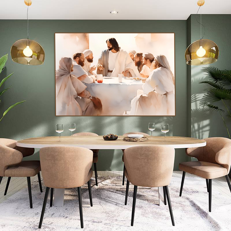 "A Santa Ceia" retrata a última refeição de Jesus com seus doze apóstolos, e o momento em que Jesus anuncia que um deles o trairá, gerando diversas reações e emoções entre os discípulos. A pintura simboliza também a instituição da Eucaristia, o ato de tomar o pão e o vinho em memória do sacrifício de Jesus pelo perdão da humanidade.